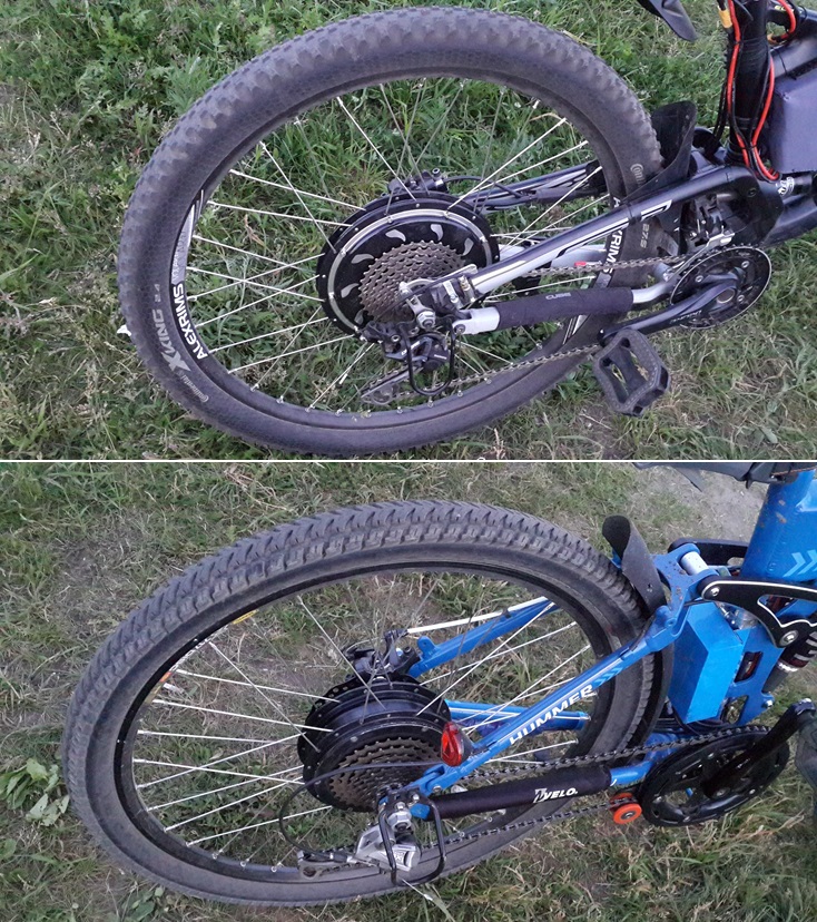 2. Нахождение контроллера в самом моторе решает проблему его размещения на раме и сильно экономит место, делая внешний вид велосипеда более приятным. Кроме того это позволяет не тянуть к нему 3-и толстых фазных провода, а ограничиться гораздо более тонкими проводами питания сокращая общее количество проводов идущих по велосипеду. Это очень важно у случае если велосипед "двухподвесный" (как у меня) и заднее колесо постоянно двигается вверх-вниз.